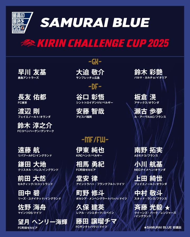 守门员:早川友基(所属球队:鹿岛鹿角)、大迫敬介(所属球队:广岛三箭)、铃木彩艳(所属球队:帕尔马)